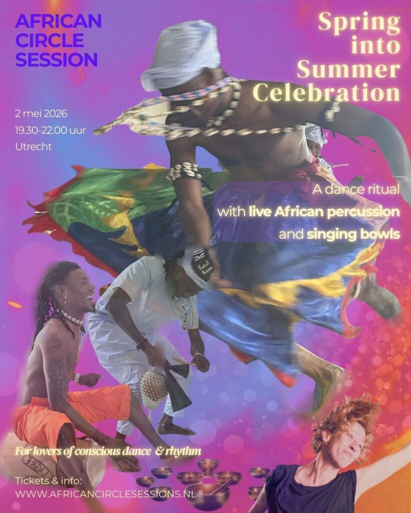 De avond ontvouwt zich als een dansreis met live polyritmische percussie uit Bénin (West-Afrika), geïmproviseerde muziek en klankhealing.