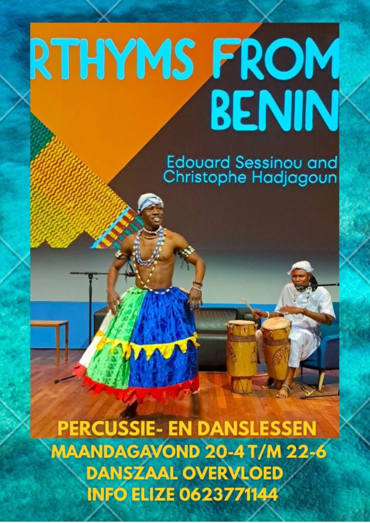 • Percussielessen van 19:00 tot 20:15 uur. Voor deze lessen zijn Beninese drums, shakers en bellen aanwezig. En als je wilt kun je bij de dansles erna meespelen.